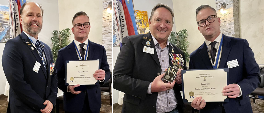Above left: Brandon Villardi receives the SAR Chapter Distinguished Service Medal from Harbor President James Bunker.