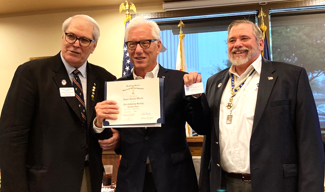 Actor and producer James Woods was inducted as a member of the Sons of the American Revolution at the Orange County Chapter meeting on January 14, 2023, by SAR Secretary General John L. Dodd and Orange County Chapter President Philip Mitchell.