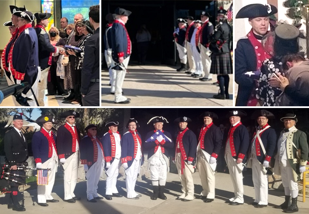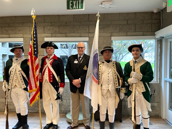 Scott Whitman, Kevin Forrest and Nolan Forrest of the South Coast Chapter assisted John Ferris and Philip Mitchell of the Orange County chapter with presenting the colors and the presentation of an America 250 Flag at a DAR Chapter event on January 16. Below are photos of the event: | (L-R) Nolan Forrest, John Ferris, Philip Mitchell, Scott Whitman, Kevin Forrest | |