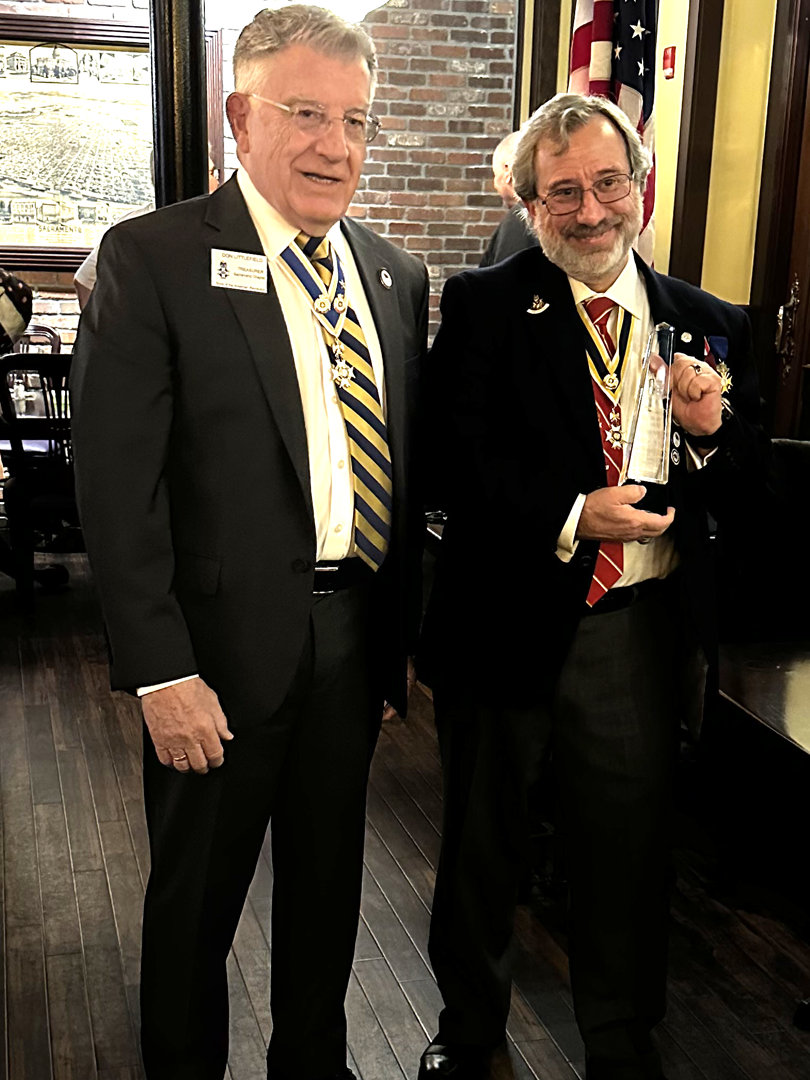Above right: James Gill is presented the SAR Chapter Meritorious Service Medal by Harbor President James Bunker.