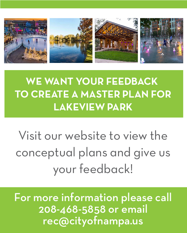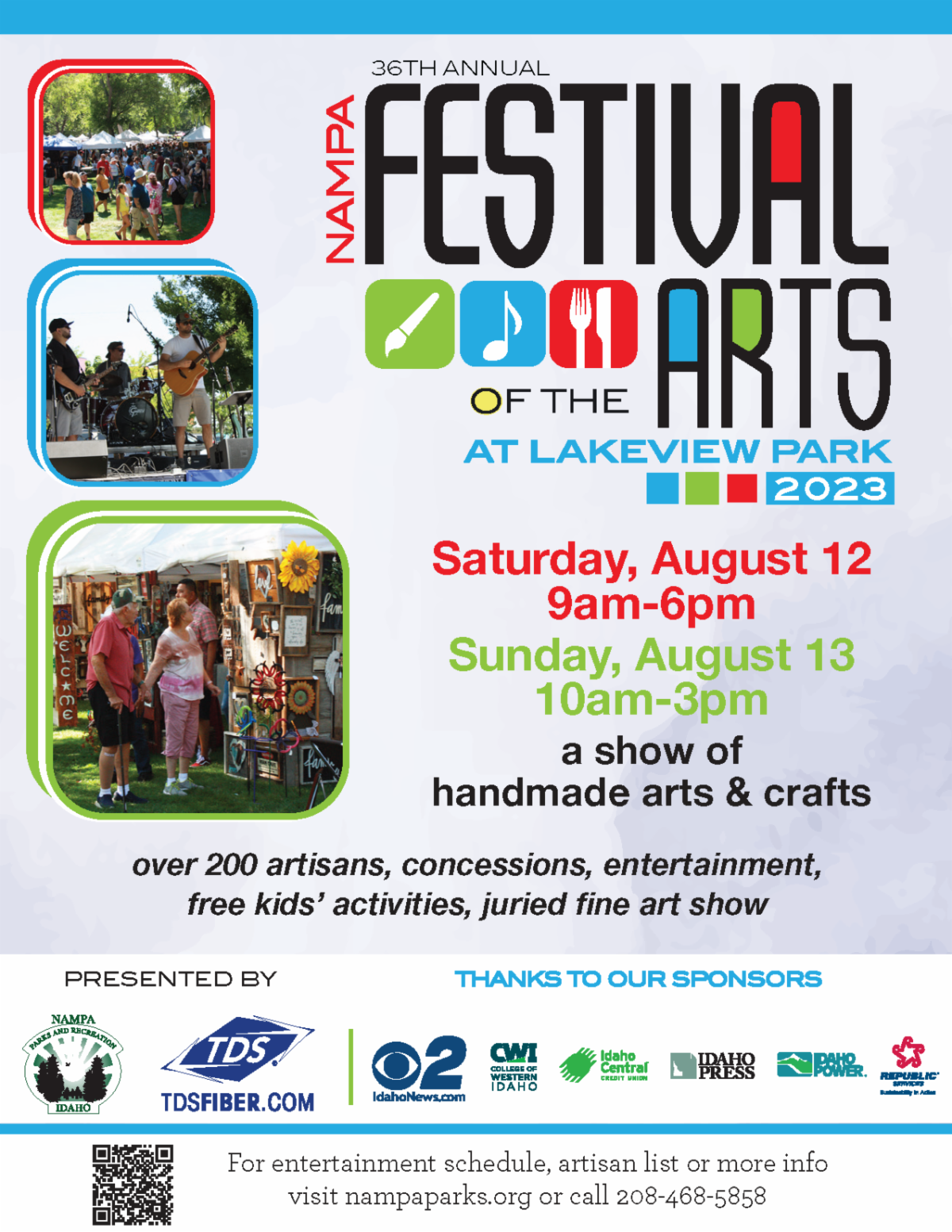 The Nampa Festival of the Arts has over 200 artisan booths, live entertainment, food concessions, and free activities for the kids, all for your enjoyment. There is truly something for everyone! Admission and parking are free. I would like to thank the Nampa Parks and Recreation staff for their work to make this community event possible.