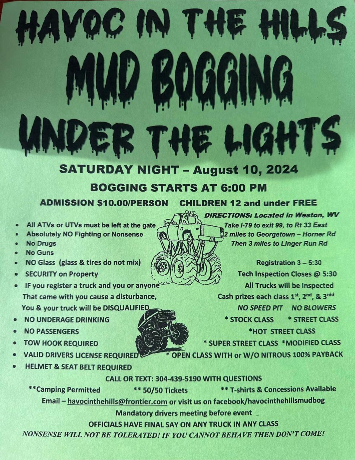 Mud Bogging Under the Lights on Linger Run Rd. Starts at 6pm. Call/ Text 304-439-5190 with questions.