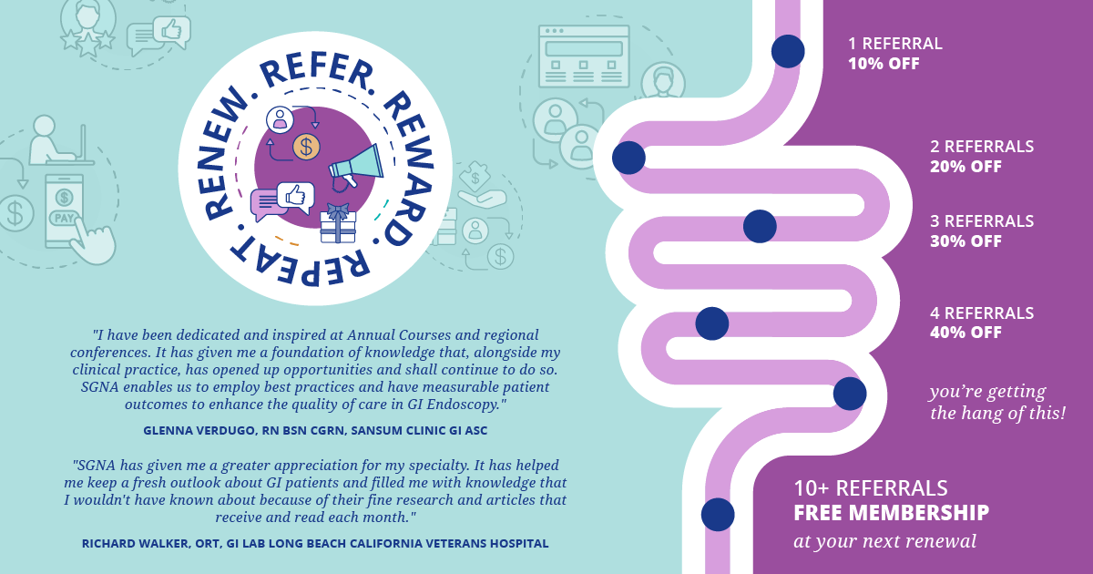 Refer a friend or colleague to save on your 2025 SGNA Membership! New members are eligible to receive SGNA benefits through December 2025 as part of our Extended Membership program, making this a great time to refer someone to our community. Each referral scores you an additional 10% off your next membership renewal. Learn more about referring a new SGNA member today.