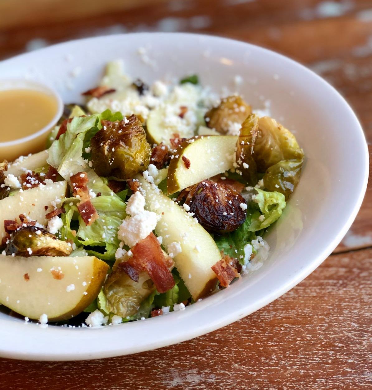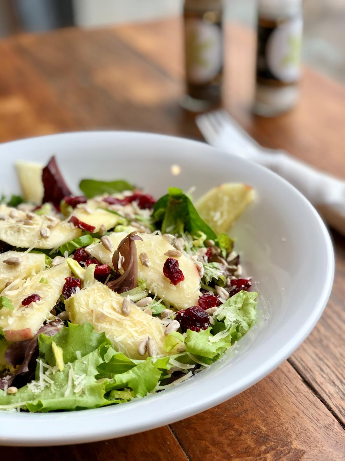mixed greens with chopped brussels sprouts, sliced apples, dried cranberries, sunflower seeds, and parmesan cheese drizzled with maple cider vinaigrette $16.45. Add marinated grilled chicken $6.95, all-natural roasted turkey $8.45, or salmon $9.95.