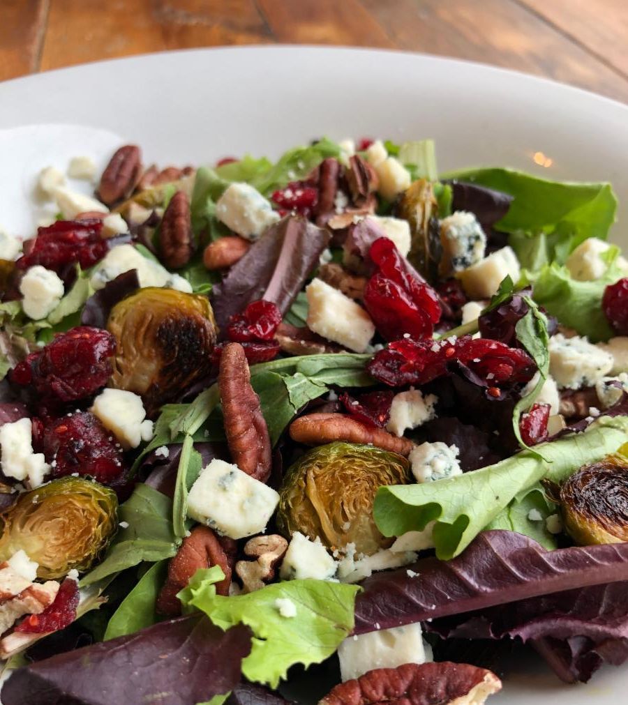 mixed greens topped with roasted brussels sprouts, dried cranberries, bacon, blue cheese, and toasted pecans drizzled with homemade dijon cider vinaigrette $19.25. Add marinated grilled chicken $6.95, all-natural roasted turkey $8.45, or salmon $9.95.