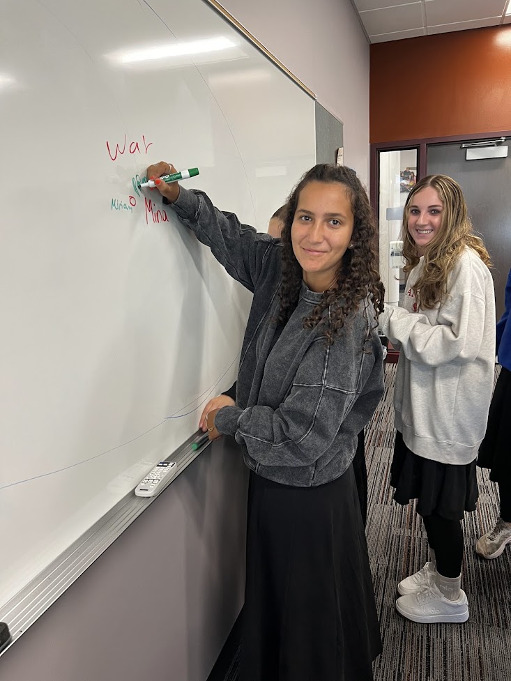 Mrs. Nussbaum shared her own experiences in Israel this summer, including her husband being called up recently. Students then took turns adding to a chart on the board which reflected on how immediate they feel news from Israel is compared with other items taking place in their daily lives.