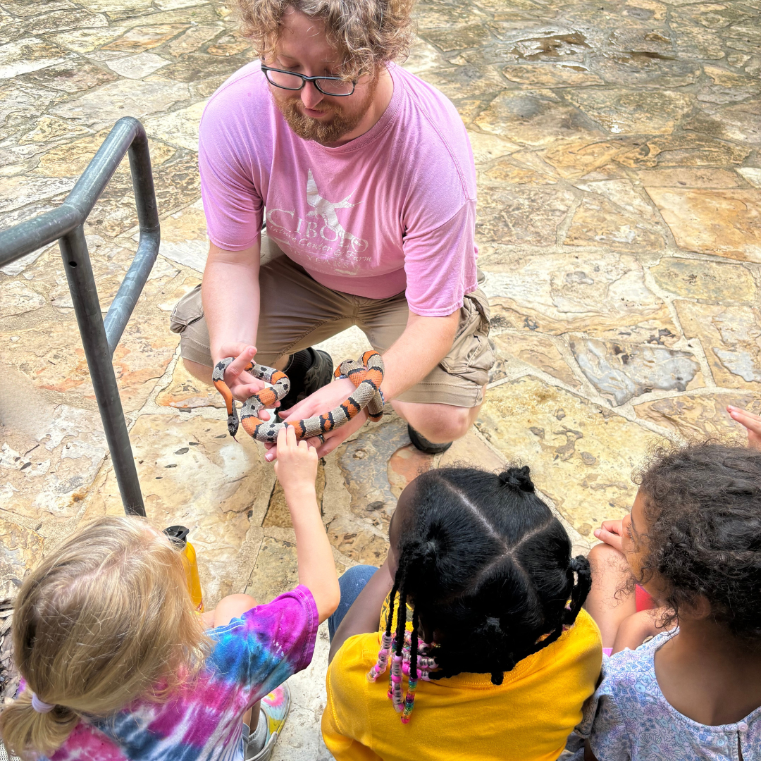 Every Friday, our campers gather for a special presentation with a guest speaker or, in this case, animal! Noah Lawrence, director of nature education at The Cibolo, led a show and tell with Cornelius, our Gray-Banded Kingsnake from West Texas. While these vibrant, nonvenomous snakes are not a rare breed, they are extremely elusive in the wild and it is considered rare to spot one!