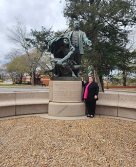 I also had a chance to see the historic Tuskegee University begun by Booker T. Washington on Independence Day in 1881. The University has been designated as the Tuskegee Institute National Historic Site by the National Park Service. Booker T. Washington and Washington Carver are both buried in the cemetery next to the chapel. The more than 3000-acre University is a private, historically Black land-grant University. Its programs include nursing, veterinary medicine, psychology, mechanical engineering, biology and the biologic sciences, business administration and management, and agriculture and animal sciences. To walk the grounds of this historic school and to know the efforts made to educate our Black citizens from 1881, touched my heart deeply. I stood and had my picture taken at the famous Booker T. Washington memorial which proclaims his goal to “lift the veil of ignorance” from the formerly enslaved people.
