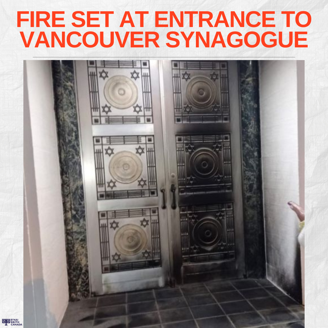 B'nai Brith Canada est indigné par l'incendie de l'entrée de la synagogue de Vancouver | | |