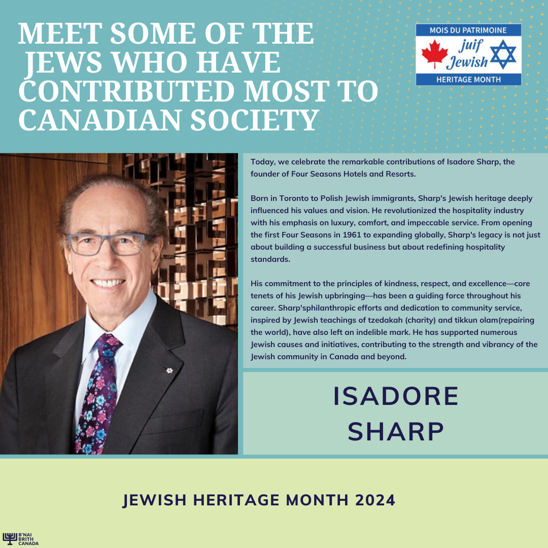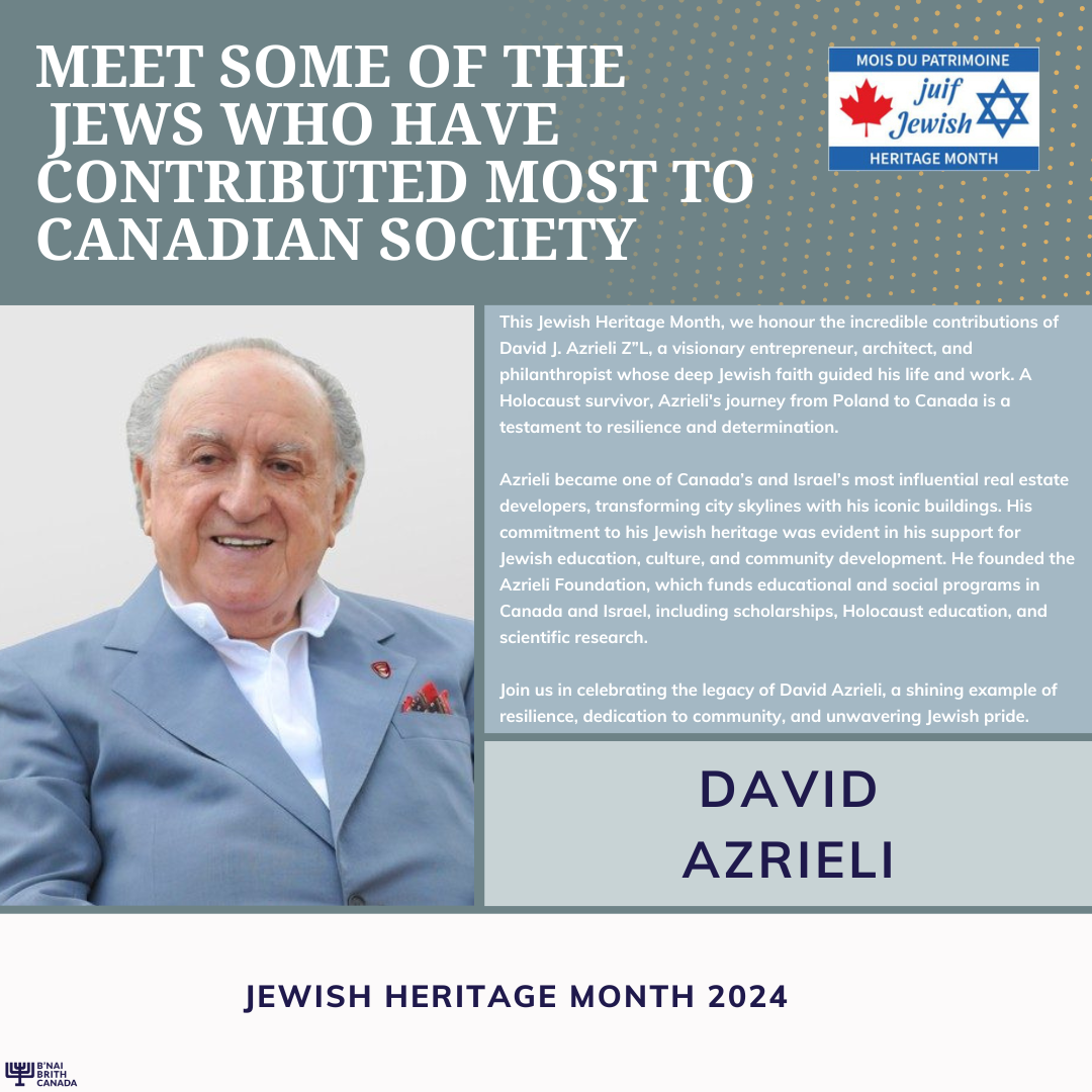 En ce Mois du patrimoine juif, B'nai Brith Canada est fier de présenter les contributions remarquables de certains Canadiens juifs qui ont façonné notre nation. Des pionniers des arts et des sciences aux chefs de file du monde des affaires et de la fonction publique, leur héritage fait partie intégrante de la mosaïque multiculturelle du Canada.