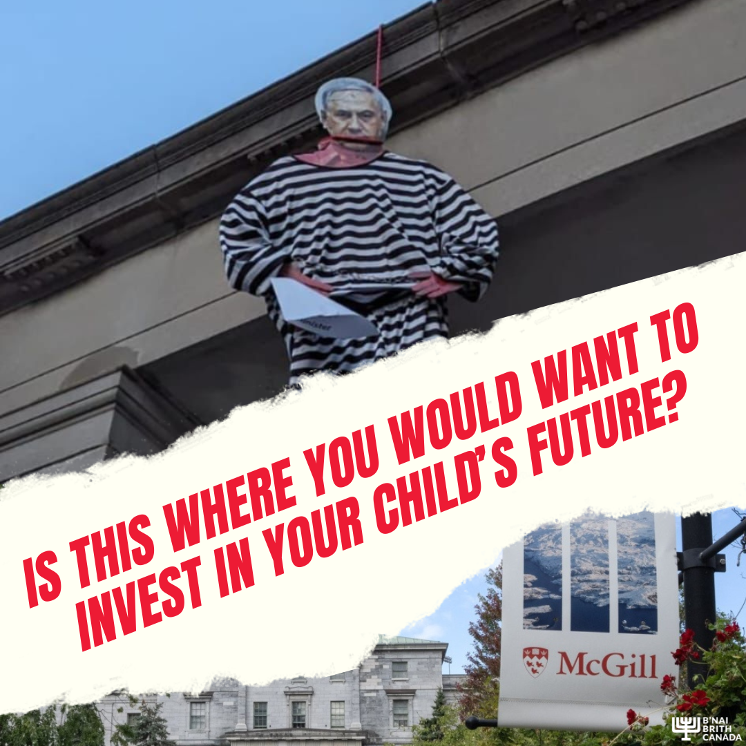 B'nai Brith is appalled by the hanging of an effigy of Israeli Prime Minister Benjamin Netanyahu from the Roddick Gates at McGill University.