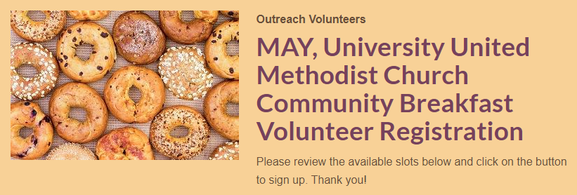 Financial donations drafted to University United Methodist Church with the destination in memo (i.e.: Food Center, winter clothing, breakfast, pet foods, etc.)