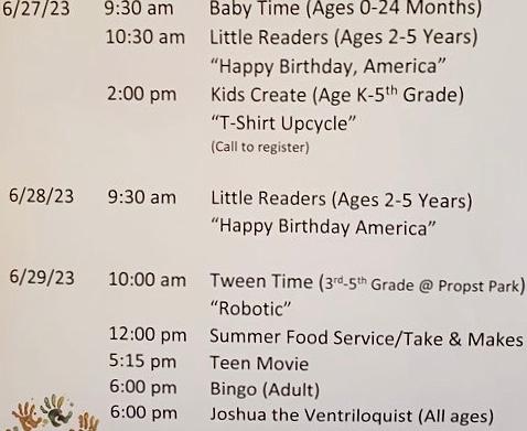 It's time for Story Time! Story Times for Summer 2023 will be: Baby Time for babies birth to 24 months will be on Tuesdays from 9:30-10:00 a.m. Little Readers is for kids ages 2-5 years old and is on either on Tuesdays at 10:30 a.m. OR Wednesdays at 9:30 a.m. Both sessions of Little Readers are the same each week-please choose one. June 6-7 will be the first week of Story Times and will continue through the end of July. If you have any questions, please call the library at 970-522-2023.