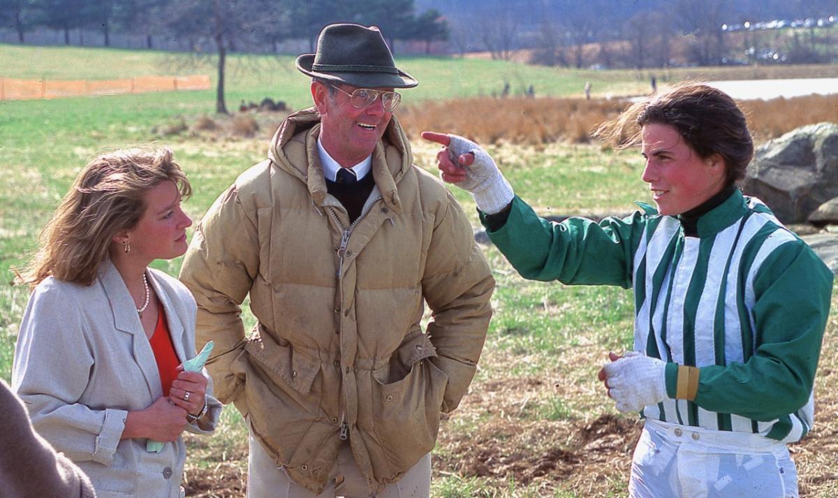On April 4, 1993, Lonesome Glory won the 1 3/4 miles Open Flat race at the Warrenton Pt. to Pt. races at Airlie, postponed from March due to snow. Left to right: Hilary Scheer Gerhardt, Bruce Miller and Blythe Miller.