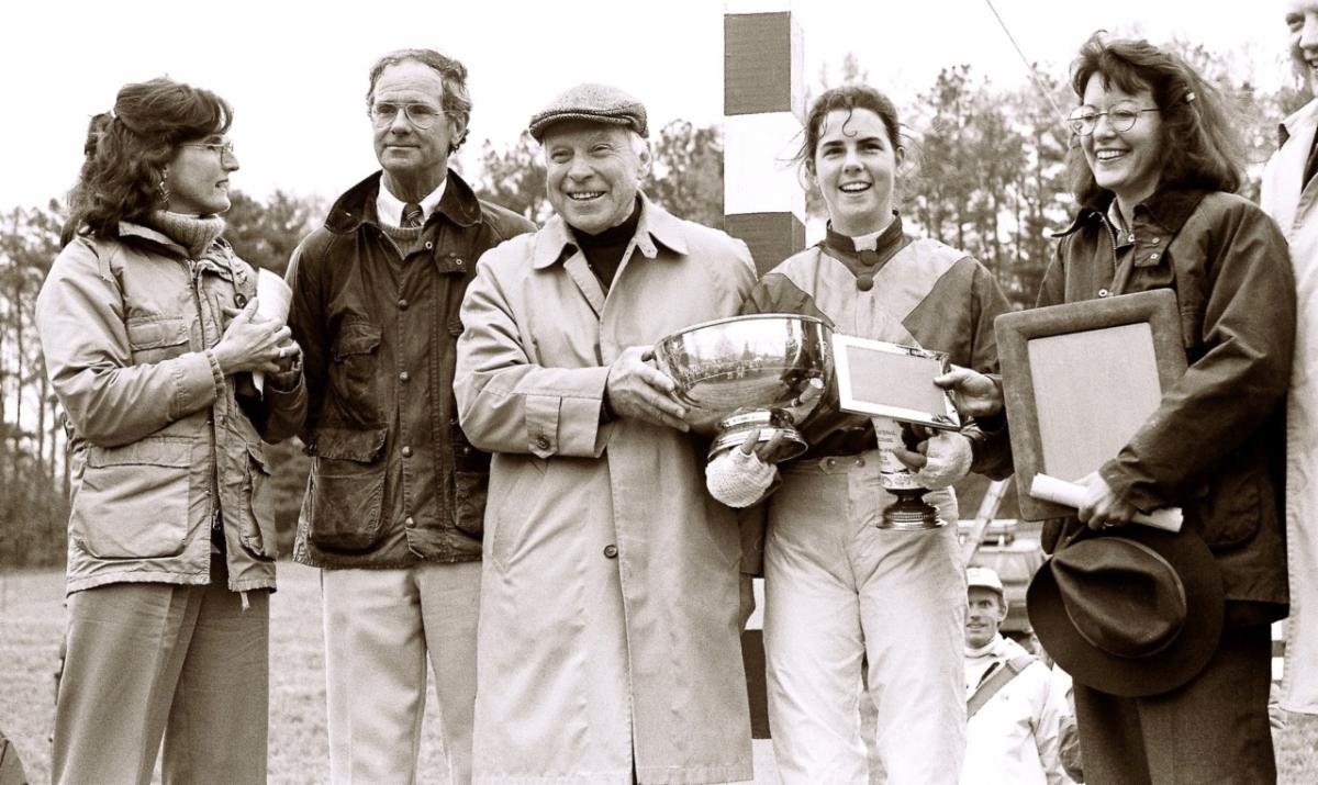 1991 Maryland Grand National trophy presentation: Old Home Farm's Cabral won the race for Blythe Miller, rider, and Bruce Miller, trainer. Nancy Miller is on the left of the picture. Stitler A. Vipond is in the center with the trophy, Mrs. Frazier is on the right.
