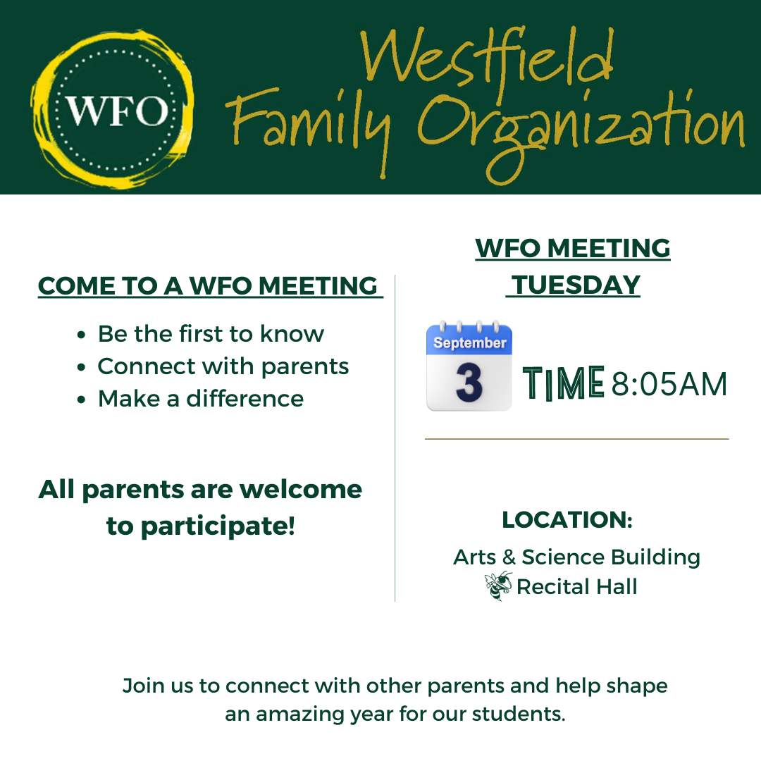 A new school year is a perfect opportunity to get involved! Monday, September 2nd is Labor Day and a school holiday. Classes will resume on Tuesday, September 3rd. Don't miss our Westfield Family Organization meeting coming up on Tuesday, September 3rd at 8:05 am in the Recital Hall. Please be sure to follow us on social media (Instagram, Facebook, and Twitter/X) -- it's a great way to stay updated and help us share and spread the good news about Westfield. It's great to be a Westfield Hornet! | | |