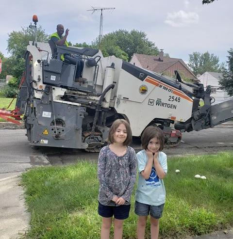 Heavy Equipment Operator Terrence Daniels took a moment while repaving streets in South Toledo Friday to stop and wave to these 7 and 8 year old sisters. The two girls, who were fascinated by the machinery, were happy he took the time to say hello from high above the street.