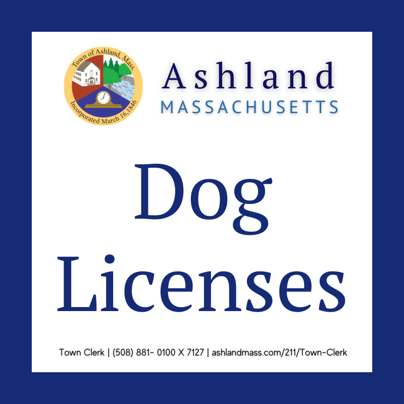 Please register your dog before April 15, 2024. A $50 fine will be added to each dog license after this date. The fee for intact dogs is $20 per dog. The fee for spayed or neutered dogs is $15 per dog but if you (the owner) are seventy (70) years of age or older then the tag is no charge. Don’t forget to bring an updated rabies certificate with you. Please note that the free license does not apply to kennels. You may license your dog using the Town of Ashland’s online system, or by dropping off the form and payment to Town Hall. If you no longer reside in Ashland, or your dog is deceased, please contact the Town Clerk’s Office by email, townclerkoffice@ashlandmass.com, or call 508-881-0100 ext. 7127 so records are updated