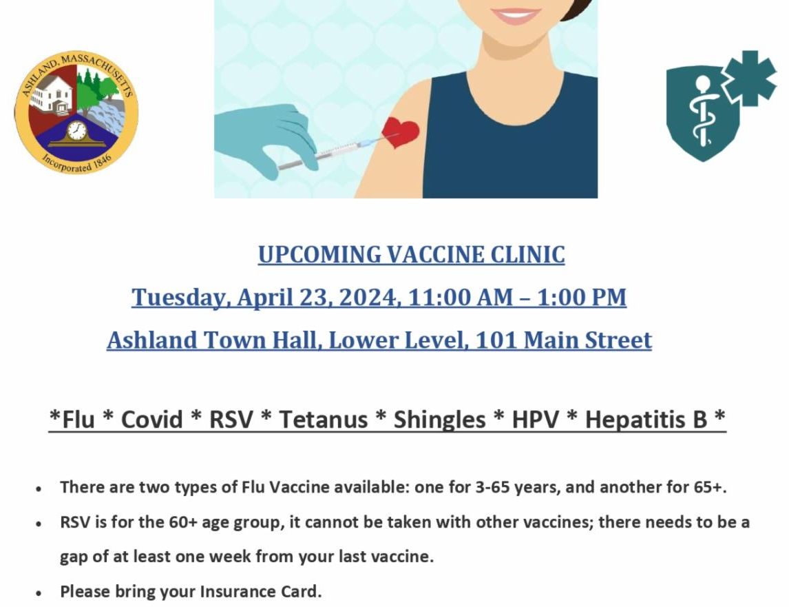 The Health Department is hosting another Flu/COVID/RSV/Tetanus Clinic this Tuesday, April 23rd from 11:00 AM – 1:00 PM at the lower level of Town Hall (101 Main St. Ashland). They are doing this in partnership with Pine Hill Pharmacy.