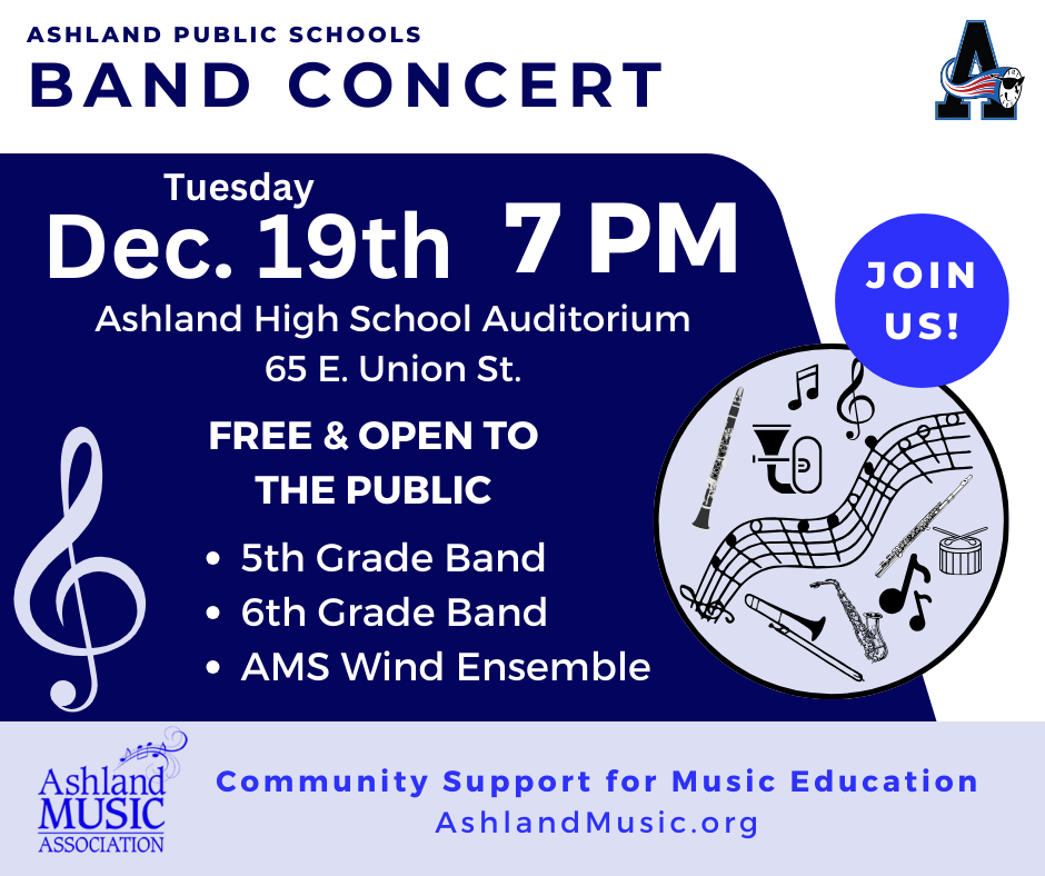 Join us for the final winter concert on Tuesday, Dec 19th at 7:00 at the AHS Auditorium as the 5th & 6th Grade Bands and AMS Wind Ensemble showcase their rising talent under the direction of Brian Koening, AMS Music Director.