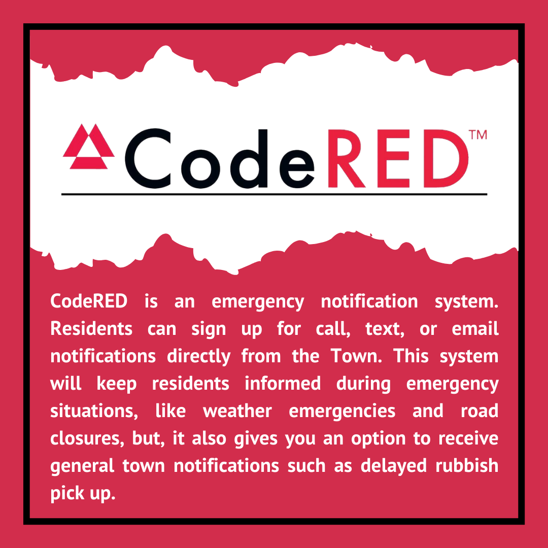 CodeRED is an emergency notification system. Residents can sign up for call, text, or email notifications directly from the Town. This system will keep residents informed during emergency situations, like weather emergencies and road closures, but, it also gives you an option to receive general town notifications such as delayed rubbish pick up.