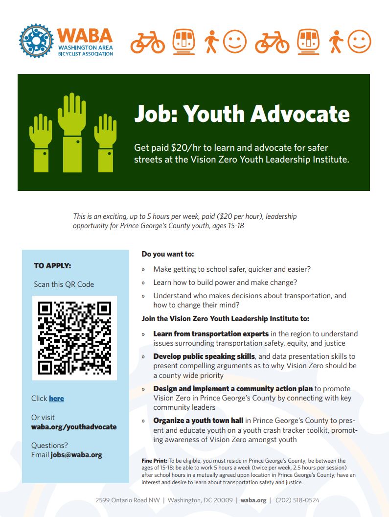 The Washington Area Bicyclist Association is seeking four committed and dedicated youth advocates, ages 15-18, for Prince George’s County Vision Zero Youth Leadership Institute.