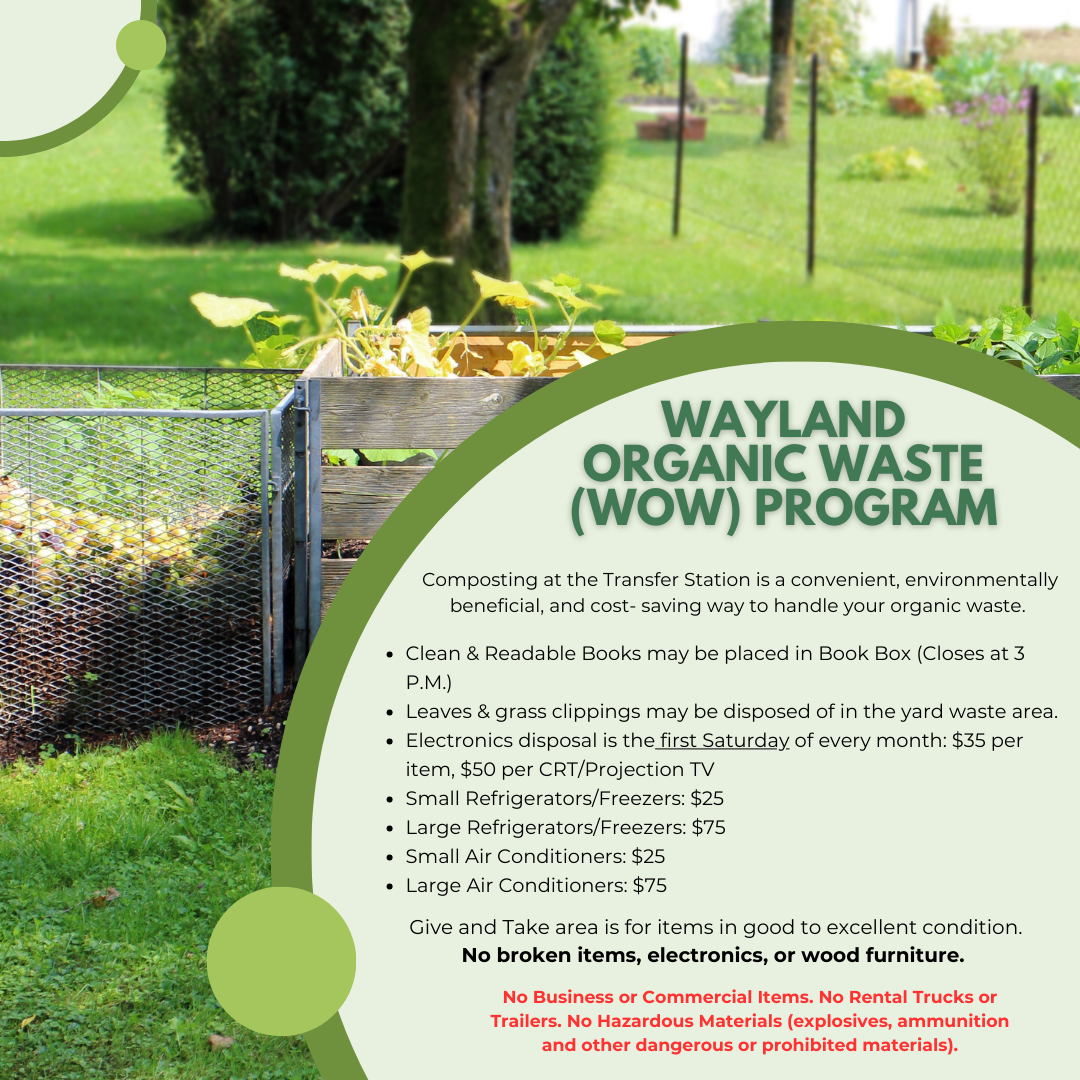 The Town of Wayland is pleased to provide trash and recycling disposal services at the Transfer Station. The Town offers “green” recycling of metal, Styrofoam bubble material, electronics, oil, batteries, tires, mattresses & box springs, yard waste, give-n-take items and textile materials & composting. Additional services include paper-shredding events and the disposal of bulky waste items (non-recyclables too large to fit in PAYT (Pay As You Throw) bags). Residents with an active Transfer Station sticker may pay these disposal fees at the Transfer Station at the time of disposal. | |