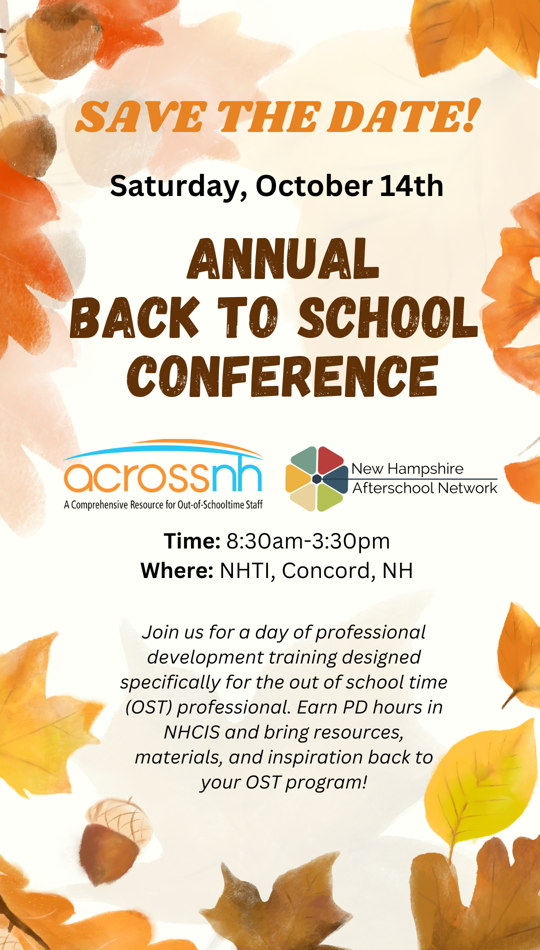 Please add Saturday, October 14th to your calendars! We are planning a day of professional development and inspiration designed specifically for the out of school time professional. The conference will be held at NHTI, Concord, NH. | Choose from 12 trainings- bring your staff, meet other OST staff from across New Hampshire, bring home resources, lesson plans, and new ideas to ignite your OST program. All participants will bring home a gift for their program! Your professional development hours will be awarded in your NH Connections Information System training transcript. | Trainings will include STEM, art, mindfulness, leadership, igniting your spark, directors sessions, earning your afterschool credential, and much more! | Registration and conference details will be announced in this newsletter and on our website... stay tuned! | Questions: Please email Cathy Hazelton, ACROSS NH Assistant Director, at chazelton@acrossnh.org. | | |