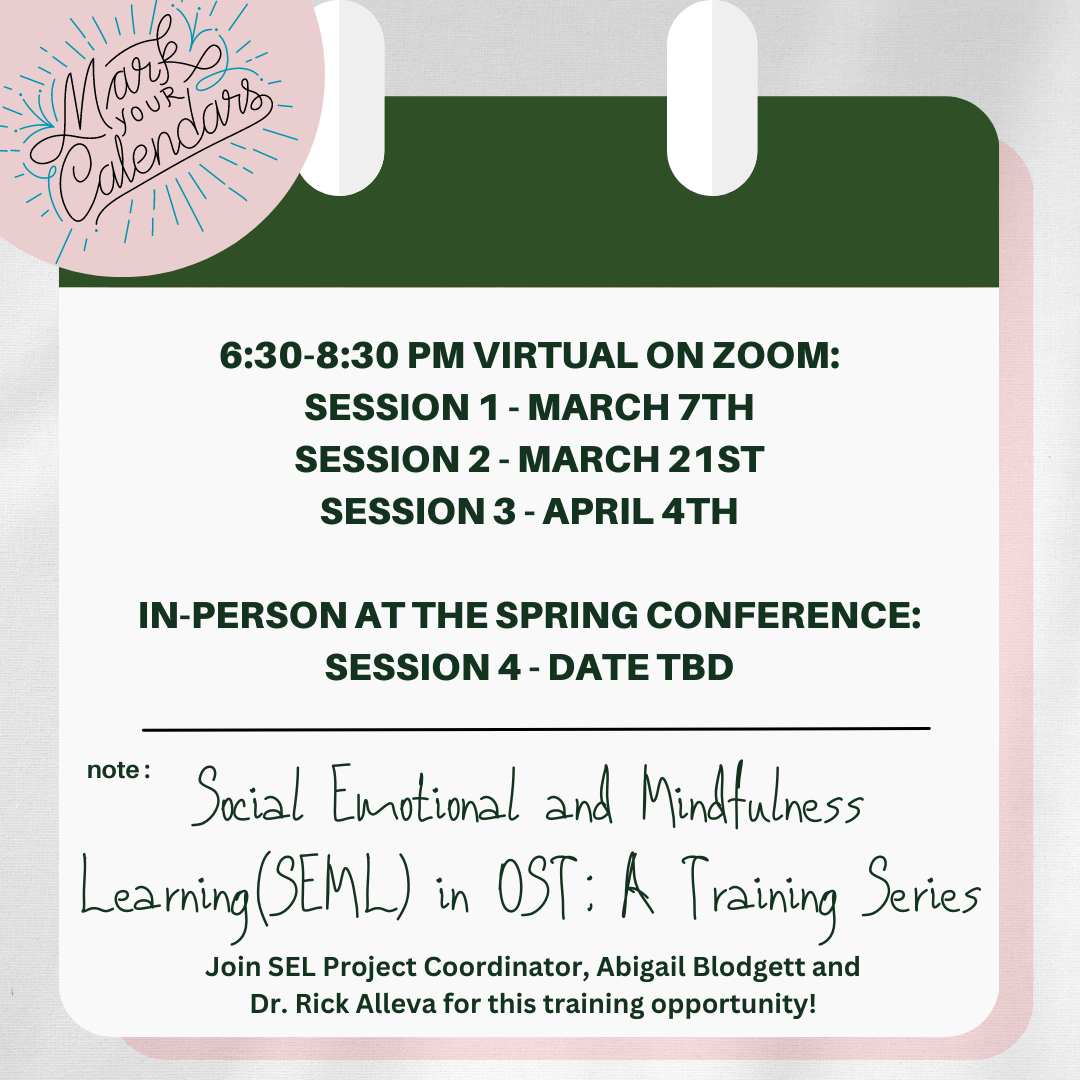 Here is more news for you... mark your calendars now for Social, Emotional, and Mindfulness Learning (SEML) in Out of School Time (OST) training in the spring of 2024! | |