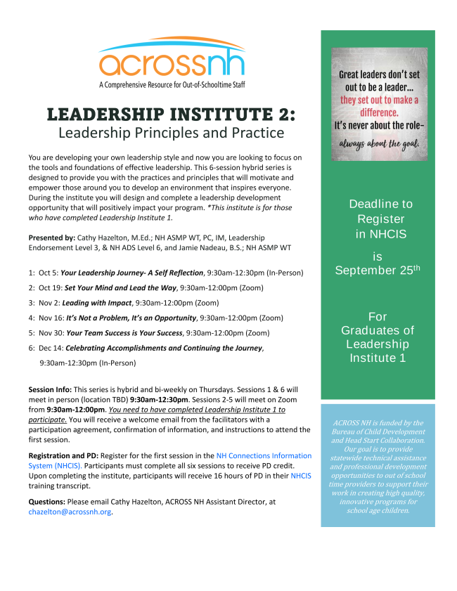 At the heart of the OST field are the values of building positive relationships, creating quality learning opportunities, and making contributions to lifelong thriving outcomes for our youth. The profound way these values connect to SEL is the driving influence underlying this six-session cohort. | Each participating program will have access to an ACROSS NH consultant to provide support for the completion of SEL implementation assignments. Participation in the cohort will require attendance of all six sessions. Click here or on the flyer image for details. | Registration and PD: Register for the first session in the NH Connections Information System (NHCIS). Participants must complete all six sessions to receive PD credit. Upon completing the cohort, participants will receive 12 hours of PD in their NHCIS training transcript. | The last day to register in NHCIS is September 25th! | |