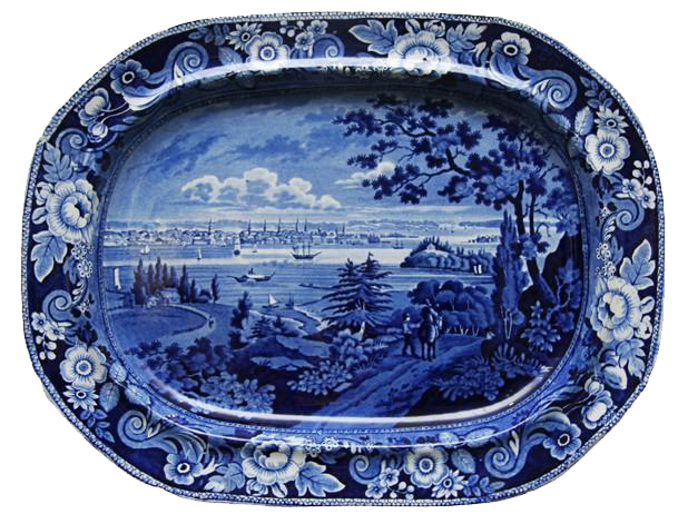 Shown is an 18.5 inch platter titled “New York from Weehawk.” It is from Andrew Stevenson’s (1810-1827) Floral and Scroll Border Series, ca. 1825. Weehawk is actually known as Weehawken. Weehawken is in New Jersey. More information.