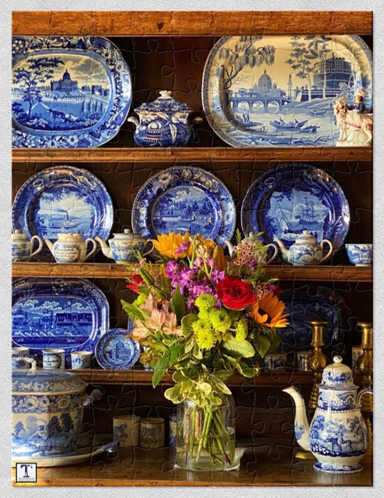 This month’s puzzle image contains a bouquet of transferware patterns representing a variety of themes that were popular in the 19th century and are popular among collectors today. This includes several American Historical views such as the Boston State House platter at the upper left and Arrival of Lafayette in New York platter at left lower center; Nautical themes are represented by the plate at center right and the steamboat at left on the same shelf, which is also an American Historical view; The Spode platter at upper right represents European scenery and city view themes, and the sugar bowl beside it represents botanical themes. In the fore of the shelf at center we see Child’s teapots and there are Child’s mugs on the shelf below. They represent another category. Finally, on the bottom shelf, we see a tureen and coffee pot with Pastoral British views, a theme with hundreds of patterns. All of these themes, and more, are included among the more than 17,000 patterns recorded in the TCC Database of Patterns and Sources. Go to the Puzzle. See past Puzzles of the Month.