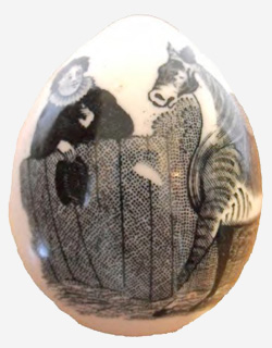 A request from Tony Calvin of Cumbria, England about a possible attribution of a jug to the (John) Wilkinson Pottery of Whitehaven, West Cumberland (1820-1867), led to the serendipitous discovery of the uses of the rare egg-shaped transfer printed objects that I have been fascinated by for years. Tony and I shared information about the jug, and thus I learned about the Wilkinson Pottery and its production of transferware eggs. Read this article.