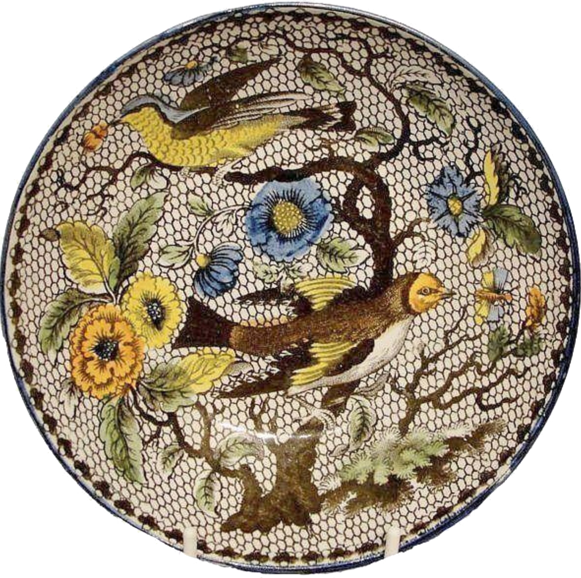 Shown is a saucer of unknown size and maker. The style of printing decoration includes high temperature painted color applied to a transfer print under the glaze. It is also known as Salopian decoration. The birds may be finches, perhaps goldfinches. For more information, this is pattern #6711 in the TCC Database of Patterns and Sources (members only). View View larger image. See past Patterns of the Month.