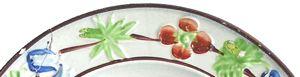 Named for a city in Persia (modern Iran), this botanical pattern with a border featuring a boat in cartouches separated by floral elements was produced by the John Ridgway pottery. The pottery was in operation from 1830 to 1841 in Hanley, Staffordshire. The “Shiraz” pattern has been documented as printed in yellow and green (like this platter), yellow and brown, and pink and black. John Ridgway was from the third generation of his family to produce pottery in Staffordshire. Several more generations would follow, and the Ridgway name would remain in use for pottery made in the region until the 1960s.