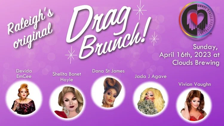April 16: 11 a.m. to 1 p.m. Sunday: Raleigh's Original Drag Brunch (In-Person Fundraiser to benefit the Triangle LGBTQ+ Community and People Living with HIV), featuring DeVida, Dana St. James, Jada J. Agave, Shelita Bonet-Hoyle, and Vivian Vaughn (Crape Myrtle Festival, Inc. at Clouds Brewing Raleigh). THE PRESENTER: https://crapemyrtlefest.org/, https://www.facebook.com/CrapeMyrtleFestival/, https://www.instagram.com/crapemyrtlefest/, https://twitter.com/crapemyrtlefest, and https://www.youtube.com/channel/UCdeHpMxbeJseU-Rx4f1QJtw. THE VENUE: https://www.cloudsbrewing.com/ralabout, https://www.facebook.com/cloudsbrewingnc, http://instagram.com/cloudsbrewingraleigh, and https://twitter.com/CloudsBrewing. DIRECTIONS (scoll down): https://www.cloudsbrewing.com/ralabout. TICKETS: $35, plus taxes and fees. Click here to buy tickets. INFORMATION: info@crapemyrtlefest.org. PLEASE DONATE TO: Crape Myrtle Festival, Inc.