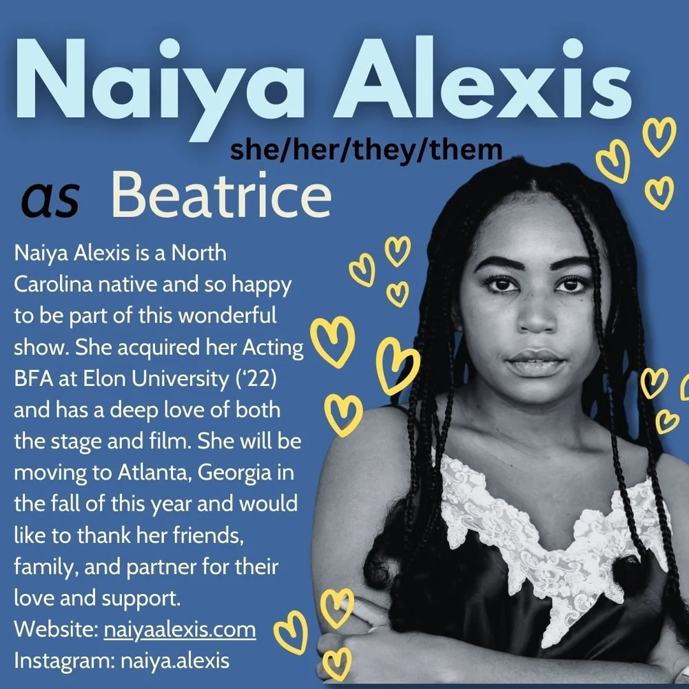 MUCH ADO (In-Person Covered Seating at 7 p.m. Thursday-Saturday and 3 p.m. Sunday, Aug. 27 and 31 and Sept. 1), based on William Shakespeare's Much Ado About Nothing, directed by Grace Siplon, and starring Naiya Alexis as Beatrice, Cameron Waters as Benedick, Daniel Cryer-Muthedath Ryder as Don Pedro, Grace Derenne as Don John, Laird Davis as Claudio, Katie Bellingham as Hero, Brook North as Dogberry, David Cole as Verges, John Paul Middlesworth as Leonato, J Camello as Conrade, Nicholas Hopf as Borachio, Pamela Alberda as Minister/Sexton, Julie Hedgeworth as Ursula, Rachel Eve Horowitz as Margaret/Antonio, and Graham Franklin as Balthazar (Blue Box Theatre Company at the Honeysuckle Tea House in Chapel Hill). PRESENTER: https://www.blueboxtheatrecompany.org/, http://facebook.com/bbxtheatre, https://www.instagram.com/theblueboxtheatre/, and https://twitter.com/BBXTheatre. VENUE: https://www.thehoneysuckleteahouse.com/, https://www.facebook.com/thehoneysuckleteahouse, and https://www.instagram.com/thehoneysuckleteahouse/. DIRECTIONS: https://www.google.com/maps/. MUCH ADO ABOUT NOTHING (five-act comedy, written in 1598-99): https://www.folger.edu/explore/shakespeares-works/much-ado-about-nothing/, https://www.bl.uk/works/much-ado-about-nothing, https://www.britannica.com/topic/Much-Ado-About-Nothing-by-Shakespeare, and https://en.wikipedia.org/wiki/Much_Ado_About_Nothing. THE SCRIPT: https://www.folger.edu/explore/shakespeares-works/much-ado-about-nothing/read/. STUDY GUIDE (Utah Shakespeare Festival): https://www.bard.org/study-guides/much-ado-about-nothing-study-guide/. WILLIAM SHAKESPEARE (Elizabethan and Jacobean playwright and poet, 1564-1616): https://www.folger.edu/explore/shakespeares-life/, https://www.bl.uk/works/a-midsummer-nights-dream, https://www.shakespeare.org.uk/explore-shakespeare/, https://www.britannica.com/biography/William-Shakespeare, and https://en.wikipedia.org/wiki/A_Midsummer_Night%27s_Dream. TICKETS: $25 ($20 students and seniors), plus taxes and fees. Click here to buy tickets. INFORMATION: https://theblueboxtheatre@gmail.com, 919-903-9131, or https://info@honeysuckleco.com. PLEASE DONATE TO: Blue Box Theatre Company.