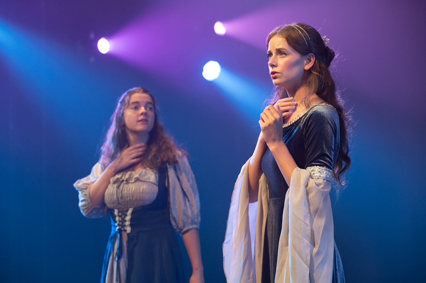 Krystin Bailey (right) plays Catherine of Valois in Henry V (photo by Catherine Davis Photography)Not content to be an austere and distant monarch, Harry yearns for true connection with those who are risking their lives for him. The scenes in which he goes undercover to commune with his men around their campfires in between melees shows us the inner workings of a man who believes in his cause but is groaning under the weight of his responsibilities. Although the St. Crispin's day speech is rousing to the bones, it's Henry's quiet fervent prayer in soliloquy on the eve of a defining battle that really hits home.