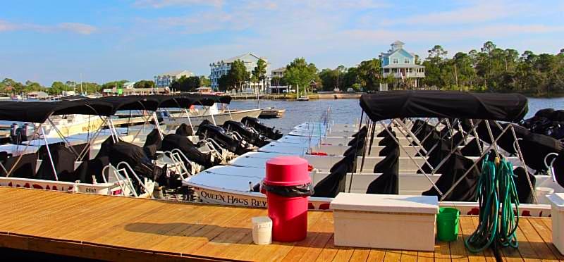 Our largest unit the, Scallywag Shack, is 6 Bedrooms and 3 1/2 baths. Granite counter tops, ceramic tile flooring, 4 bedrooms 2 bath downstairs with outside hot water shower, 1/2 bath in the laundry. Upstairs has 2 bedrooms and 1 bathroom, full kitchen and living area and a large covered and screened deck. Sleeps maximum of 15. Great for groups, meetings or events! Click here for more details.
