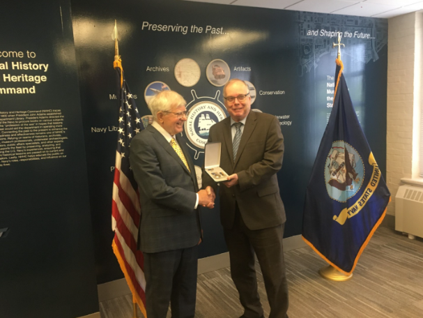 Last Thursday, Naval History and Heritage Command Director Rear Adm. Sam Cox, USN (Ret.), presented Jim D’Angelo a Navy Superior Public Service Award at a ceremony at the Washington Navy Yard in recognition of the Air Force veteran’s past advocacy for greater recognition to those who fought and died at the Battle of Midway. Following a 1992 symposium held in Arlington, Virginia, that brought together veterans, historians, and authors that covered the significance of the battle, D’Angelo—a passionate student of the subject—organized the International Midway Memorial Foundation (IMMF) which eventually erected a monument at the US Naval Academy, thanks to the generosity of the Class of 1942. In 1996, the IMMF began to host Midway Night Dinners at the Navy’s flagship museum in Washington, DC, modeled on the Trafalgar Night Dinner that had become a tradition within the Royal Navy. On 4 June 1999, inspired by D’Angelo’s initiatives, then-Chief of Naval Operations Adm. Jay Johnson declared Midway Night as one of only two events to be celebrated annually Navy-wide (the other is the Navy’s 13 October birth date). Presented nearly a quarter-century after Admiral Johnson’s decree, the Navy Superior Public Service Award is a well-deserved honor! | |