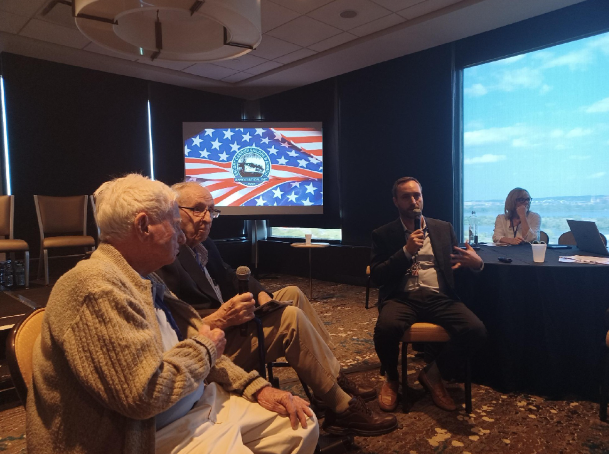 Travis Bickford of the Library of Congress Veterans History Program facilitates a discussion with escort carrier veterans James Tatum (left) of USS Sangamon (CVE 26) and Robert Kruger of USS Bogue (CVE 9). The roundtable session proved to be one of several highlights of the Escort Carrier History Symposium. | |
