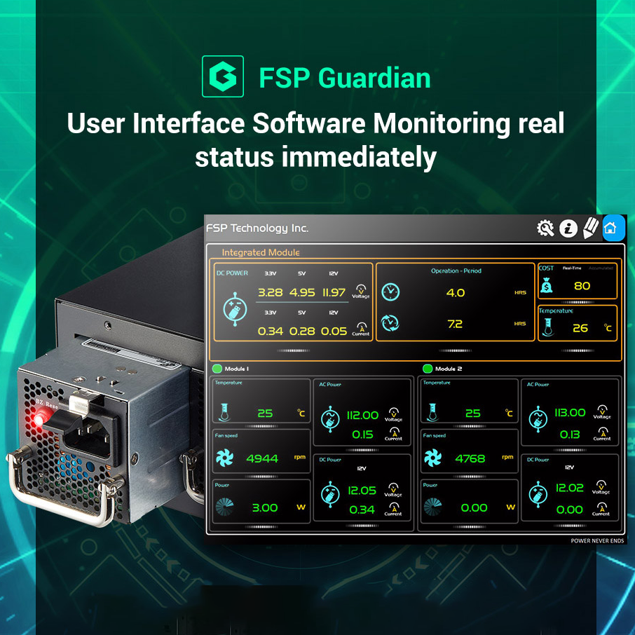 The Twins Pro series can be synced with the FSP Guardian software to monitor power input, power output, efficiency, and other internal records in real-time.