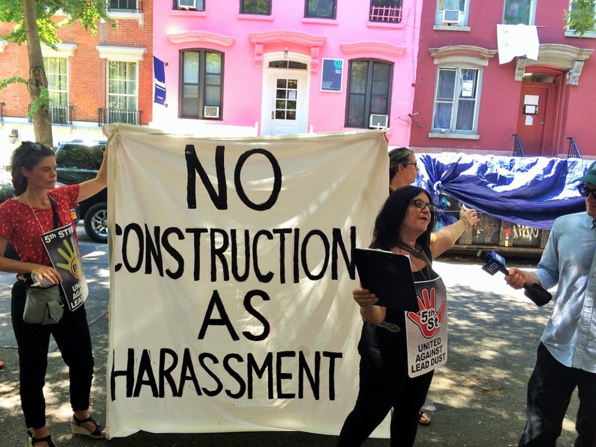 Tenants rallied against "construction as harassment" outside their buildings on E. Fifth Street between Cooper Square and Second Avenue (2021). | |
