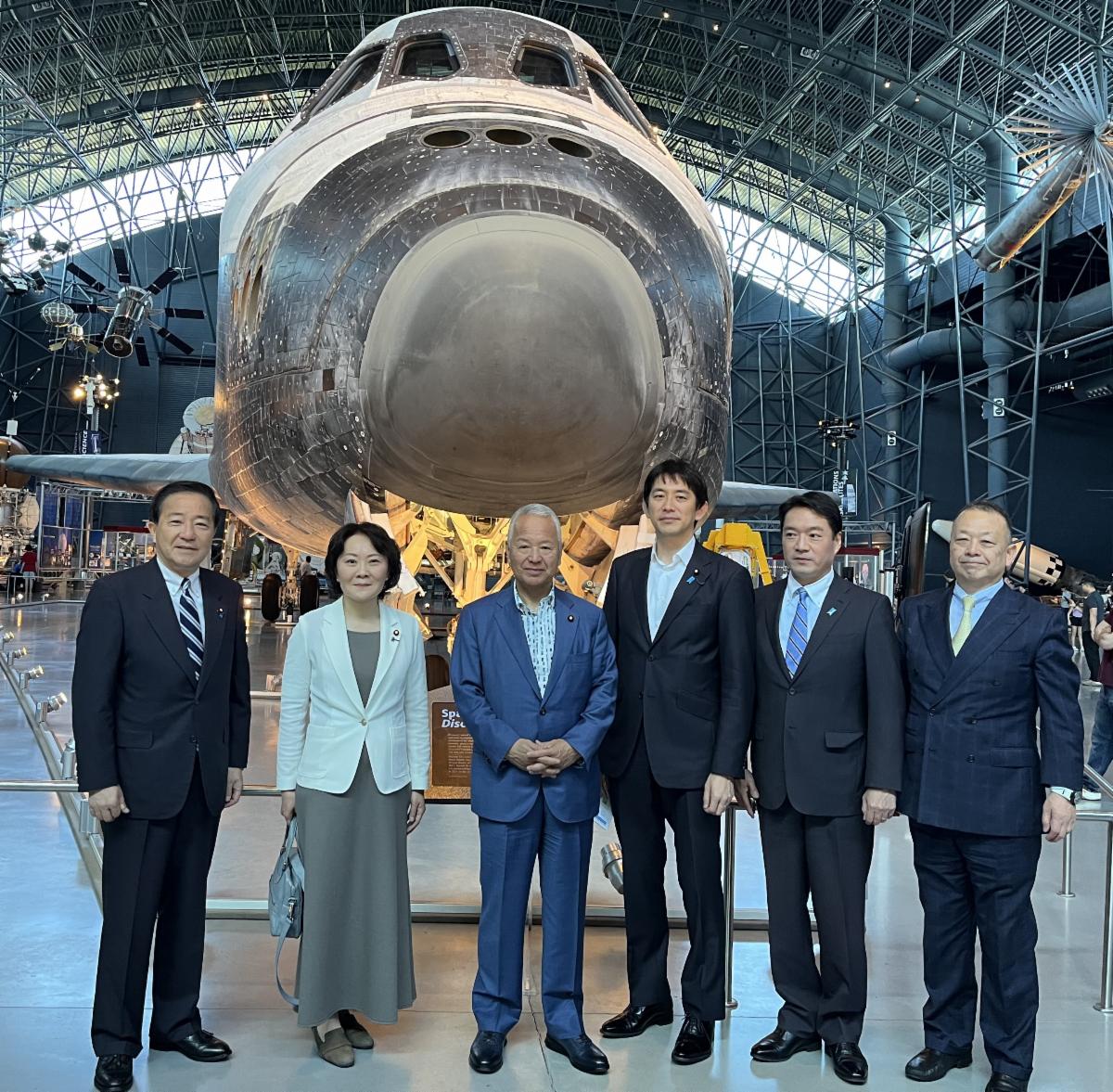 Photo (left to right): Hon. Akihisa Nagashima, Hon. Miki Yamada, Hon. Akira Amari, Hon. Takayuki Kobayashi, Hon. Masanao Ozaki, and Dr. Satohiro Akimoto in front of the space shuttle Discovery at the National Air and Space Museum's Steven F. Udvar-Hazy Center