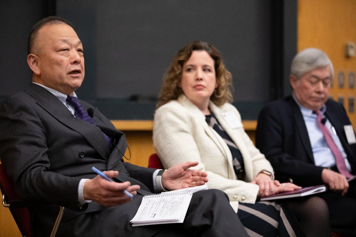 Photo (left to right): Dr. Satohiro Akimoto, Ms. Greer Meisels, and Mr. Glen S. Fukushima at Harvard University's Regional Studies East Asia 75th Anniversary Symposium (Photo credit: Marissa Fiorucci)