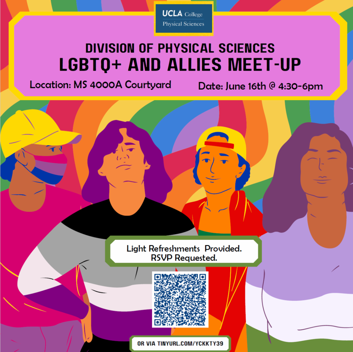 June is Pride Month and the UCLA Division of Physical Sciences will be celebrating with a LGBTQ+ and Allies Meet-up on June 16th from 4:30-6:00pm. The gathering will take place at the Mathematical Sciences 4000A Courtyard.