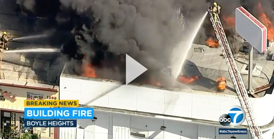 A massive fire erupted at a former bank building in Boyle Heights and authorities say a person of interest is being interviewed. The blaze was reported at around 1:30 p.m. at a vacant, single-story structure located at 1308 S. Soto St, according to the Los Angeles Fire Department. AIR7 HD captured intense flames quickly burning through the roof of the building, sending a towering column of thick black smoke into the air. LAFD investigators said a fire in the attic quickly spread throughout the vacant building, which was mostly boarded up. Los Angeles firefighters worked for almost two hours to fully put out the blaze. One firefighter was reportedly being evaluated at the scene for minor injuries.