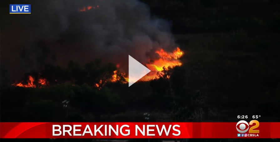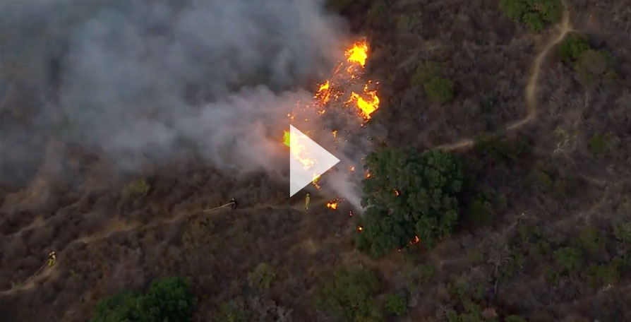 A small brushfire broke out Thursday in the Hollywood Hills above the 3400 block of Barham Boulevard and just north of the 101 Freeway. Crews with the Los Angeles Fire Department responded to the fire at around 6:19 p.m. Video from Sky5 captured smoke and fire coming from the hillside above nearby apartment complexes, with the fire burning in light to medium vegetation in a light wind. Firefighters could also be seen pulling a hose up the steep hillside. It took crews about 40 minutes to surround and extinguish the blaze, which was kept to less than a quarter acre, LAFD tweeted.