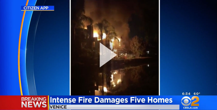 A major emergency blaze destroyed one home that was being renovated and damaged several others in Venice before firefighters were got control of the flames. The fire was first reported at 10:44 p.m. Sunday at 421 Carroll Canal, along the Venice Canals. The blaze was declared out just after midnight, thanks to the more than 100 firefighters dispatched to battle it, according to Margaret Stewart of the Los Angeles Fire Department. A total of five homes were damaged, Stewart said. The three-story home that was being renovated was fully involved in flames when firefighters arrived and has been declared a total loss, along with one of the neighboring homes. Three others were damaged to the eaves from ember cast, she said.
