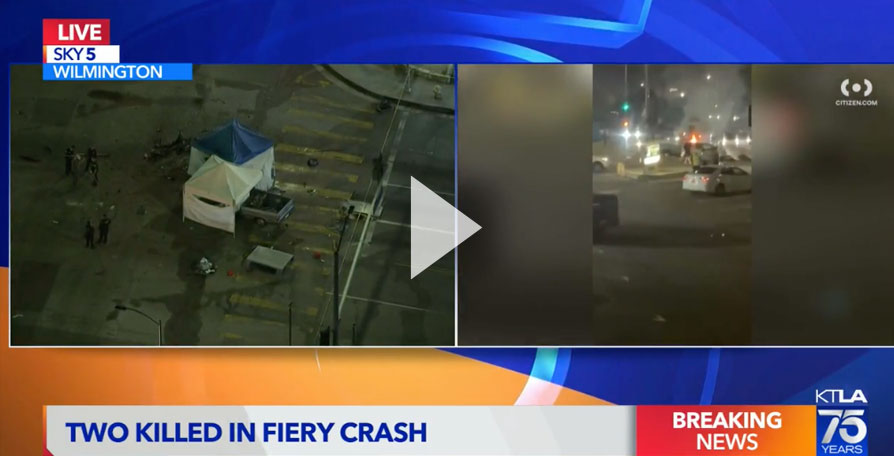 Two people died in a collision involving two vehicles in Wilmington Thursday night, officials said. The crash occurred around 8:15 p.m. at the intersection of Avalon and Lomita boulevards. By the time Los Angeles fire crews arrived, a vehicle that had been on fire was extinguished, but one person was dead. The LAFD worked to extricate another passenger, but that person had also died from their injuries.